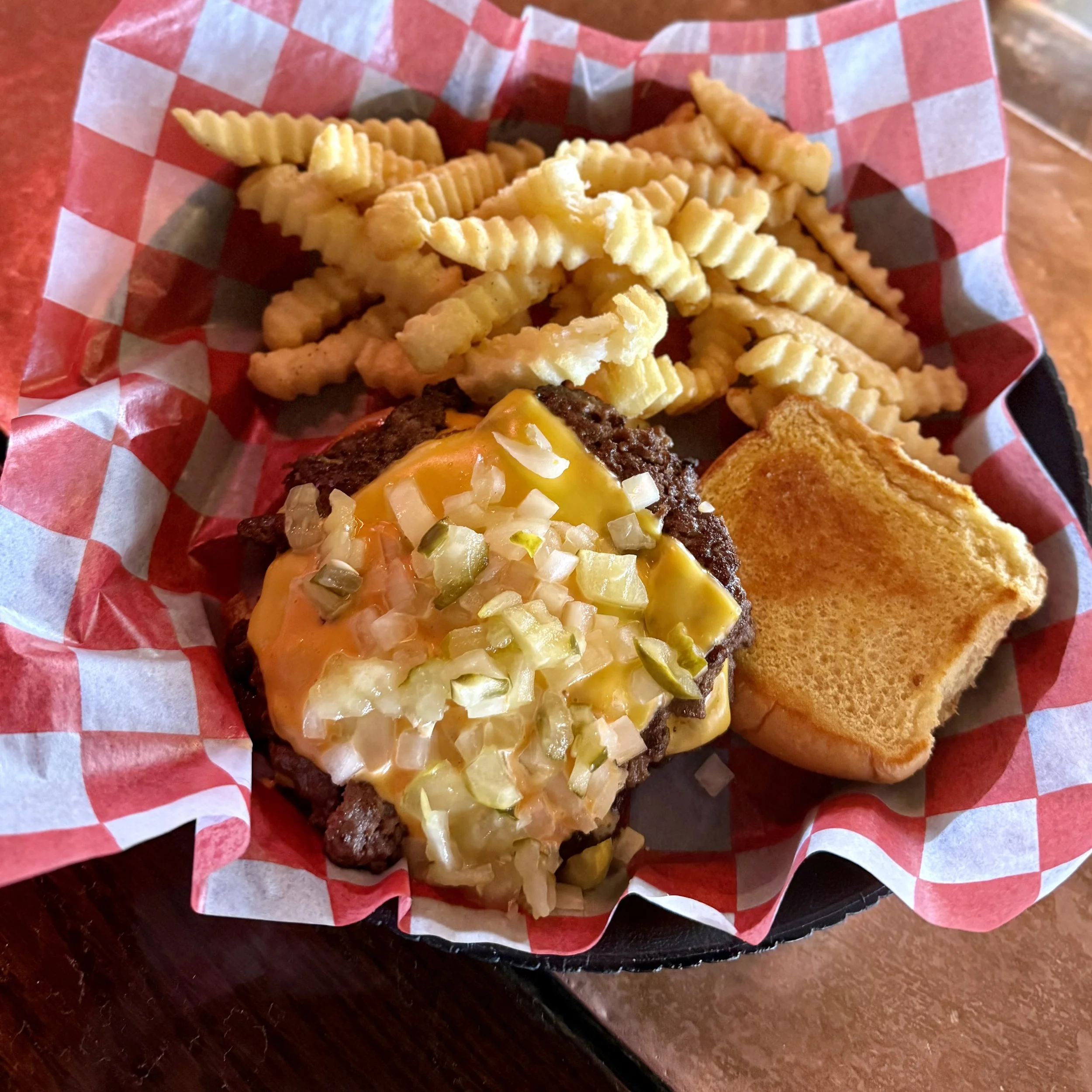 April’s burger was a favorite of Donny’s and so we named it after him! Two smash burger patties topped with American cheese, Thousand Island Sauce, and finished with diced onions and pickles on a toasted bun. Ronald Who?